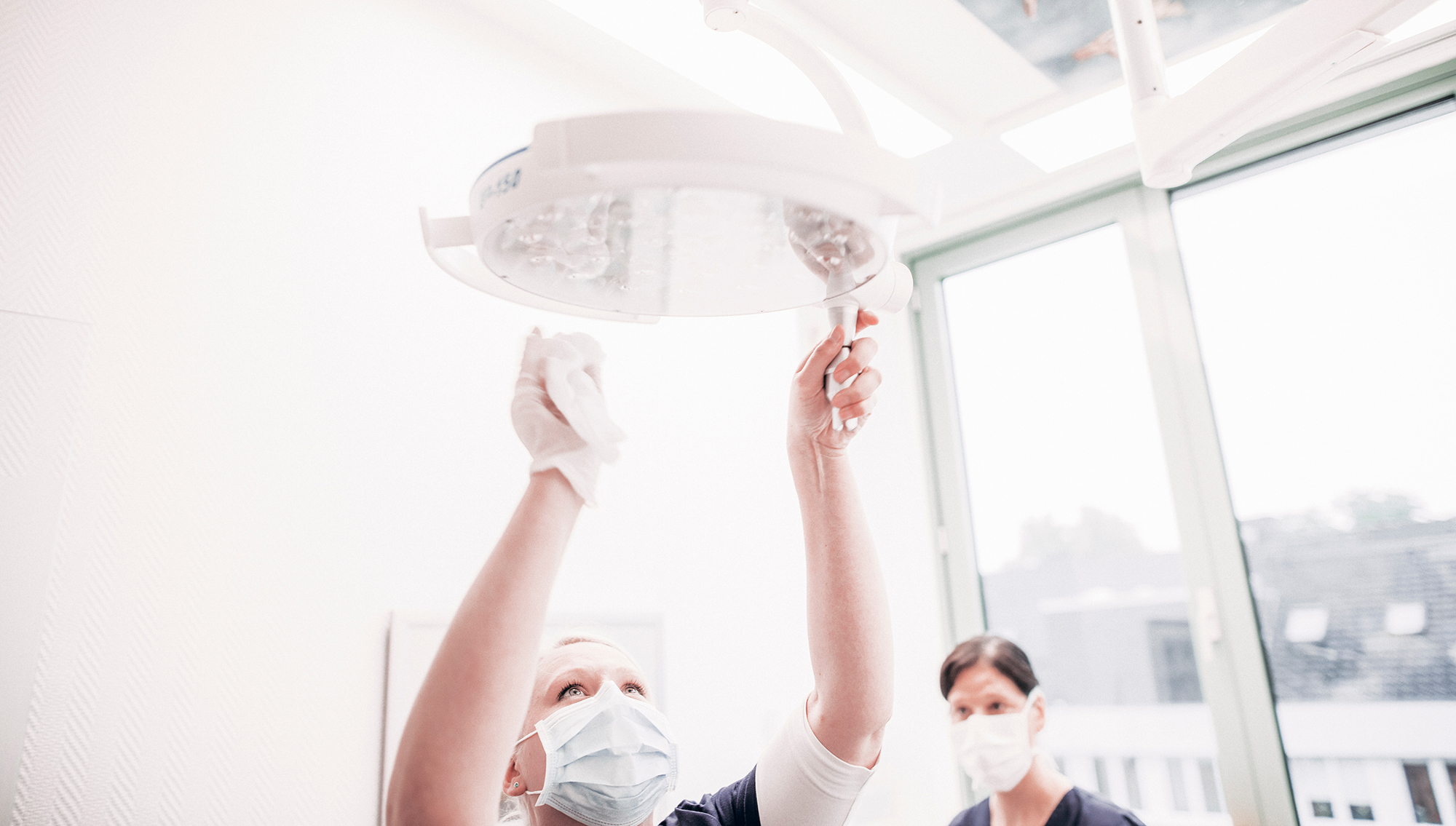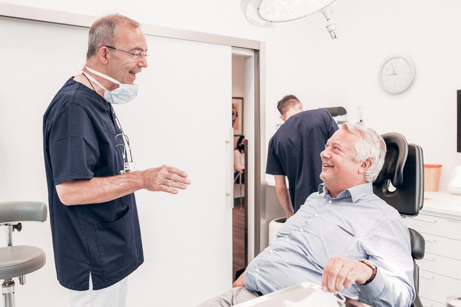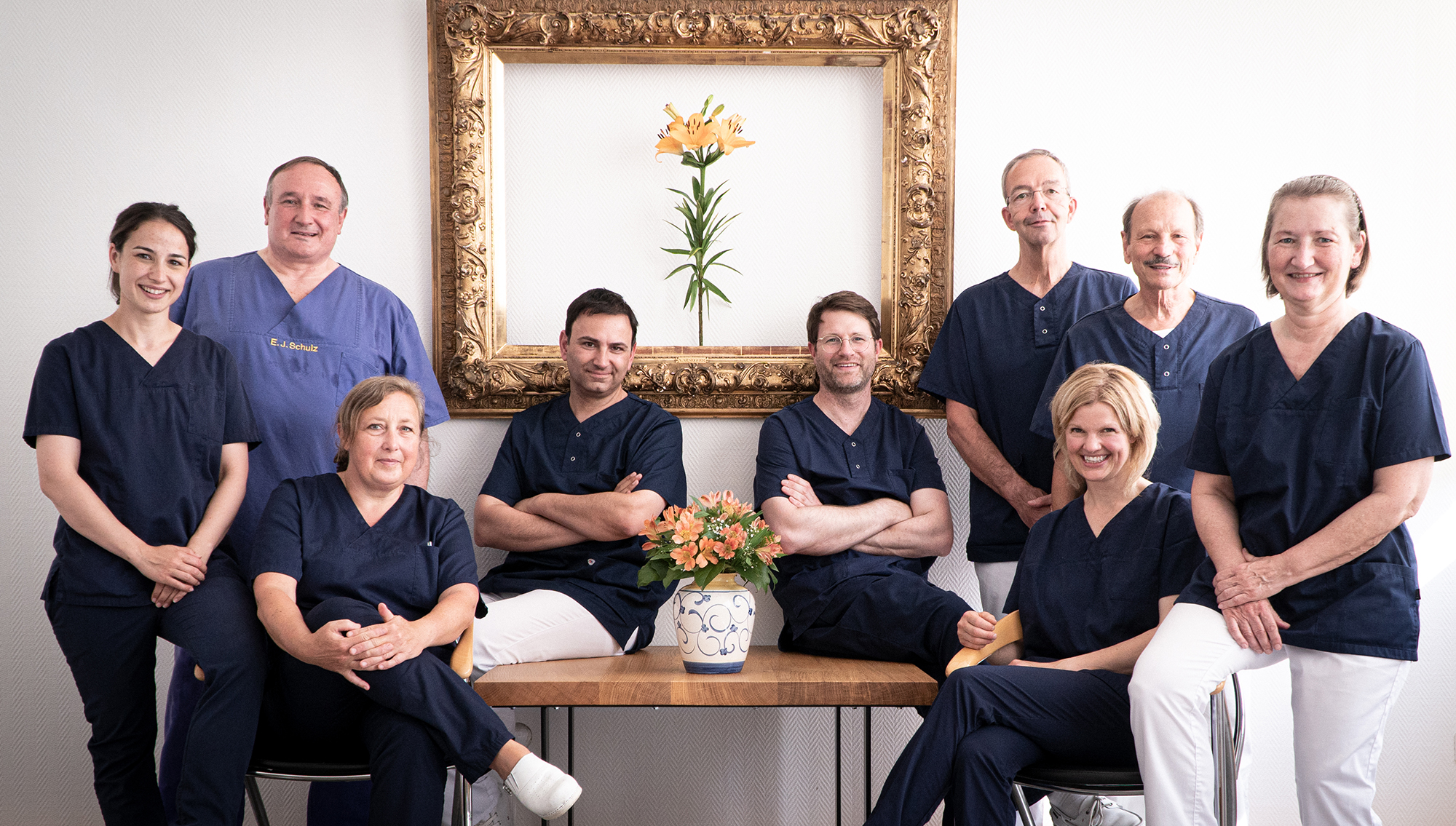 Eine Behandlung steht und fällt mit dem guten Zusammenspiel aller Beteiligten. Hand in Hand und in routinierten Strukturen setzen sich unsere rund 50 Mitarbeitenden für ihre Patienten ein. Von Empfang und Termin-Vereinbarung, über zahnmedizinische Fachangestellte, Arzt- und Zahnarzthelferinnen bis zu Zahntechnikerinnen, jede Aufgabe ist eine Schnittstelle zur nächsten. Die zwei großen Teams sind farblich sichtbar gekennzeichnet. Das Team mit den violetten Shirts ist verantwortlich für die Praxis-Organisation. Das blaue Team unterstützt die Ärzte in den Eingriffsräumen. Seltener sehen Sie die vielen Kollegen im Hintergrund. Unentbehrlich sind unsere Sterilgut-Assistentinnen, unsere Wäschefee, die Dentalhygienikerin, die Hygienebeauftragten und auch unsere externe Krankenhaushygienikerin mit curricularer Fachweiterbildung.