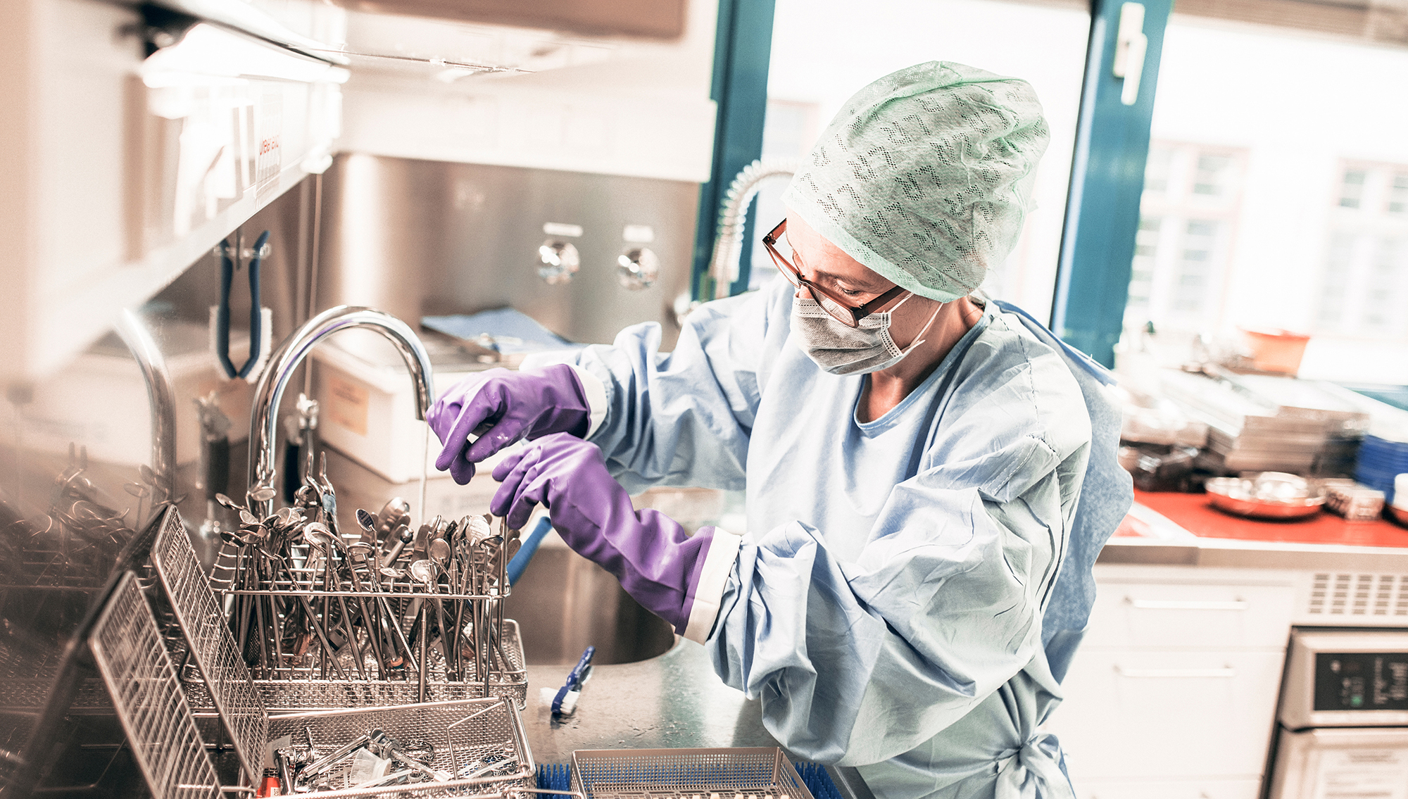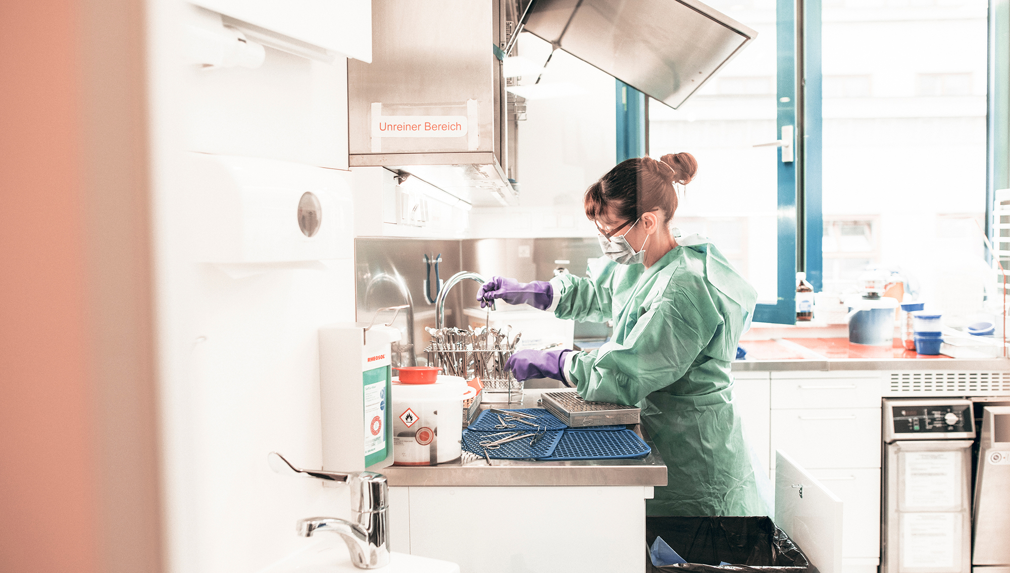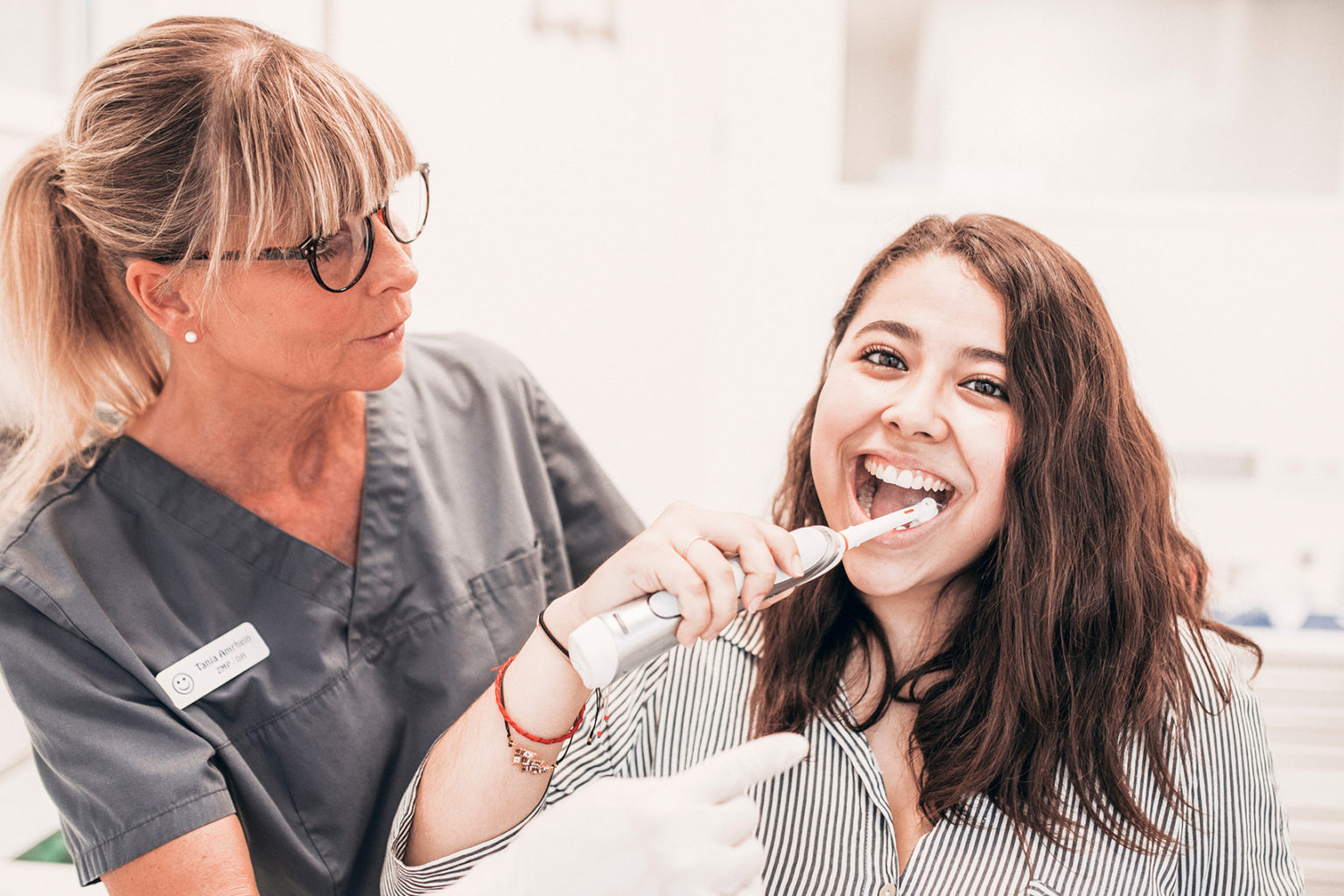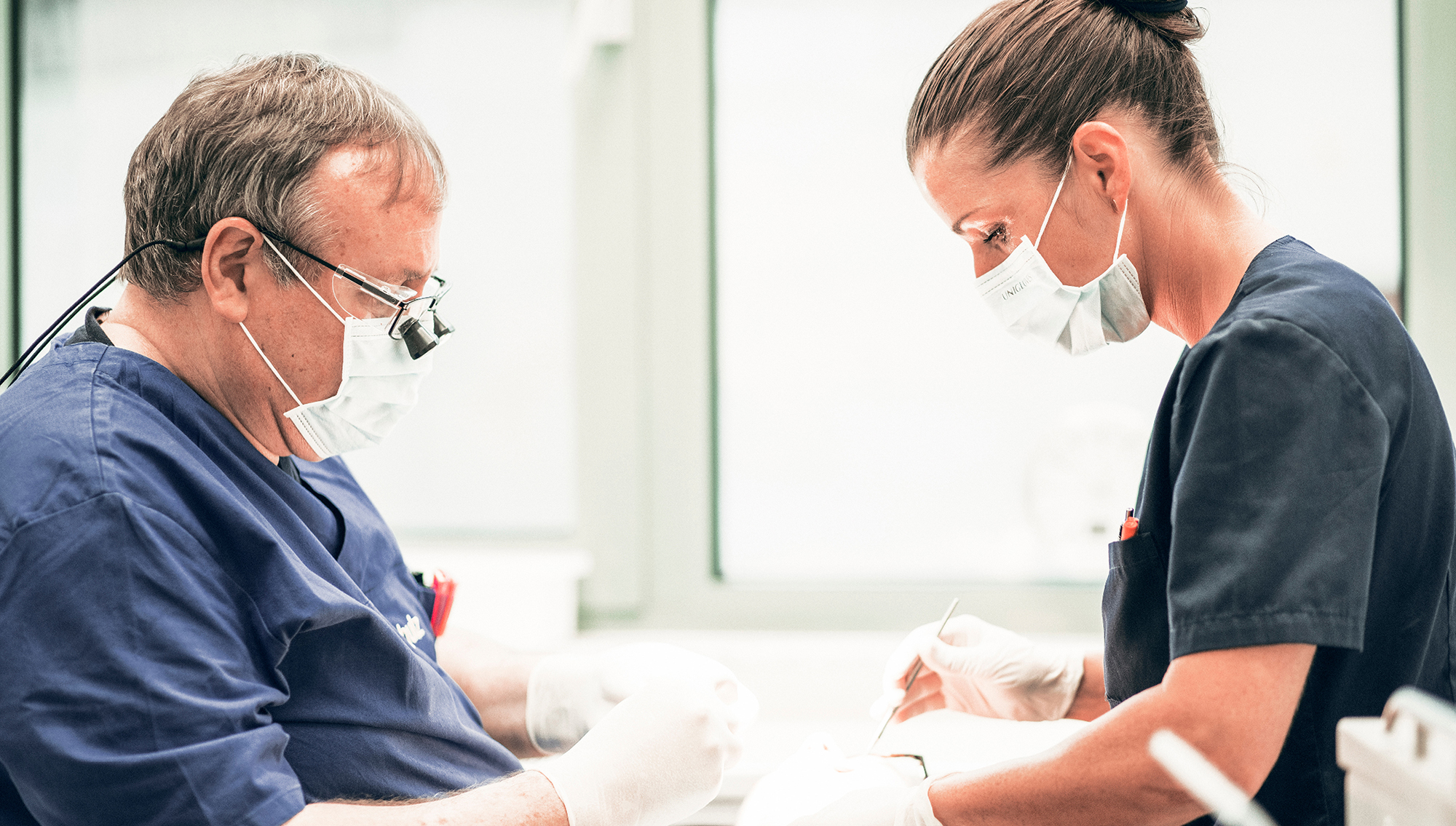 Eine Behandlung steht und fällt mit dem guten Zusammenspiel aller Beteiligten. Hand in Hand und in routinierten Strukturen setzen sich unsere rund 50 Mitarbeitenden für ihre Patienten ein. Von Empfang und Termin-Vereinbarung, über zahnmedizinische Fachangestellte, Arzt- und Zahnarzthelferinnen bis zu Zahntechnikerinnen, jede Aufgabe ist eine Schnittstelle zur nächsten. Die zwei großen Teams sind farblich sichtbar gekennzeichnet. Das Team mit den violetten Shirts ist verantwortlich für die Praxis-Organisation. Das blaue Team unterstützt die Ärzte in den Eingriffsräumen. Seltener sehen Sie die vielen Kollegen im Hintergrund. Unentbehrlich sind unsere Sterilgut-Assistentinnen, unsere Wäschefee, die Dentalhygienikerin, die Hygienebeauftragten und auch unsere externe Krankenhaushygienikerin mit curricularer Fachweiterbildung.